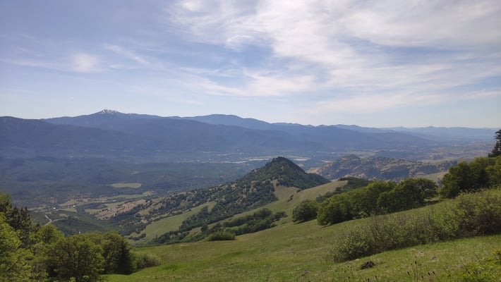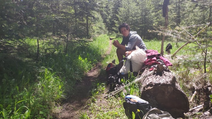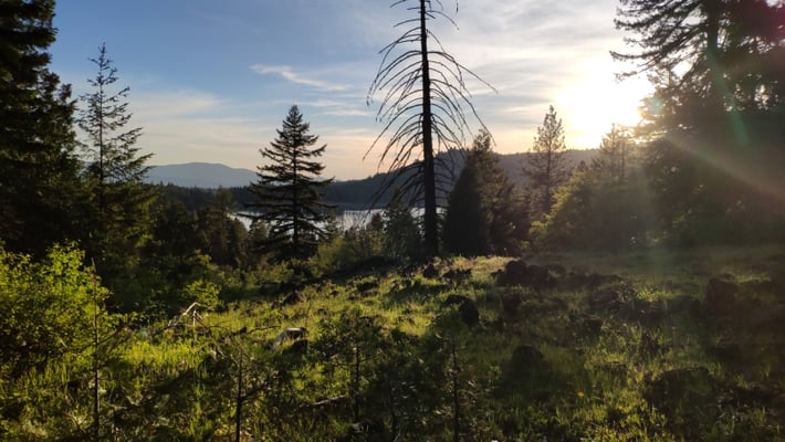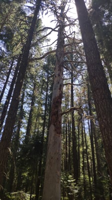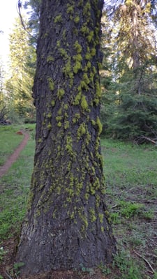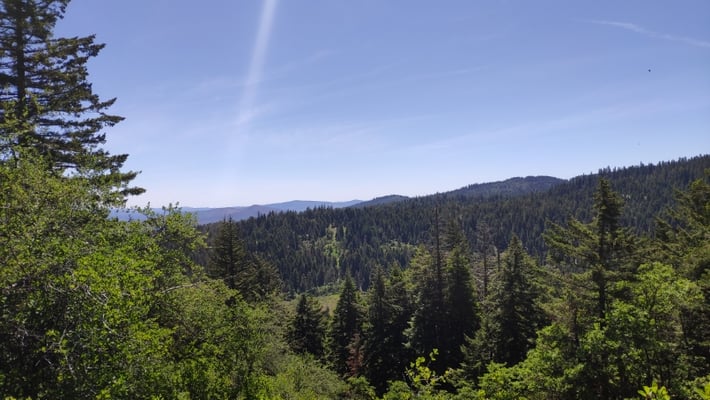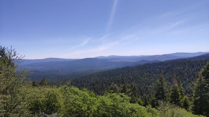 Die nächsten Stunden liefen wir "einsam" durch Wälder und grüne Bergwiesen, trafen kaum auf Menschen, da die Hiker, die den PCT southbound, also von Kanada nach Süden laufen, aufgrund des Schnees erst Anfang Juli starten. Die Landschaft erinnerte etwas an den Schwarzwald, nur die Bäume wachsen höher hinaus. Walderdbeeren gab's zuhauf. Löwenzahn erhellte das Grün immer wieder mit Gelb. Veilchen zeigten sich immer wieder, eine Art Annemone bedeckte große Flächen. Auch viele uns unbekannte Pflanzen mit prächtigen Blüten bedeckten den Waldboden. Alle zusammen trugen zu einem unglaublichen Duft bei. Wir wundern uns immer über die vielen "Zotteln" (Flechten), die von den Bäumen herunterhängen, und den Wald in eine verwunschene Märchenstimmung verwandeln.
