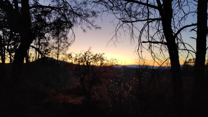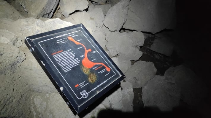 Auf dem Weg bis zum neuen Trailregister, mein Ziel für heute, 10, 12 Meilen, also so um die 20 Kilometer, für die ich mindestens 4 Stunden brauche, liegt die Lavacave. Da es dort drinnen dunkel ist und man nur mit Lampe rein kann, sage ich mir, die guck ich noch an. Bin dort wieder eine Stunde, lese die Tafeln, Rucksack lasse ich davor stehen. Dann weiter und hoch zur Hat Creek Rim mit Outlook, an dem ich natürlich nichts mehr sehe. Die Rim wird sich aber noch viele Meilen den nächsten Tag hinziehen und das Hat Creek Tal werde ich am nächsten Morgen wiedersehen. Ich möchte einfach weiter. Am Outlook mit Parkplatz steht aber ein Toilettenhäuschen mit zwei Toiletten, rechts davon ist ein Parkplatz für Ausflügler. Die Toiletten hier gelten laut Guthook als die saubersten und so war es auch. Die Häuschen sind von der Tagessonne her immer sehr warm und, da es inzwischen wieder recht kalt und windig war, überlege ich, einfach im Häuschen meine Matte aufzuschlagen. Nein, ich laufe weiter. Das Laufen in der Dunkelheit kann je nach Topographie unglaublich beruhigend sein. Wenn ich oben laufen und nicht in dichtem Wald (die ich Hänsel und Gretel-Wald getauft habe), ist es sehr beruhigend. Wenn die Temperatur wärmer ist, fühle ich mich auch sicherer, als wenn sie kalt ist - muss mal einen Psychologen fragen ;-)) Ich treffen eine Kuhfamilie mit 2 Kälbchen und erschrecke nicht, da ich in Guthook von "weird cows" gelesen hatte. Die ganze weitere Strecke ist von Kuhfladen übersäht, sehe aber keine Kühe mehr. Komme tatsächlich bis zum Trailregister, das Freund Money Maker in Guthook wieder mit blumigen Worten gewürdigt hat. Der Weg dahin war sehr steinig, uneben und anspruchsvoll und ich bin gestürzt (hat nichts mit der Nacht zu tun, wäre tagsüber genauso möglich). Ein Tier hatte den Trail unterhöhlt, ich bin eingebrochen und trotz Stöcken auf die Knie gefallen. Konnte mich aber ganz gut abfangen. Unter Pinien finde ich einen ebenen Platz, es ist nach Mitternacht, kochen, essen, Salbe auf Knie.