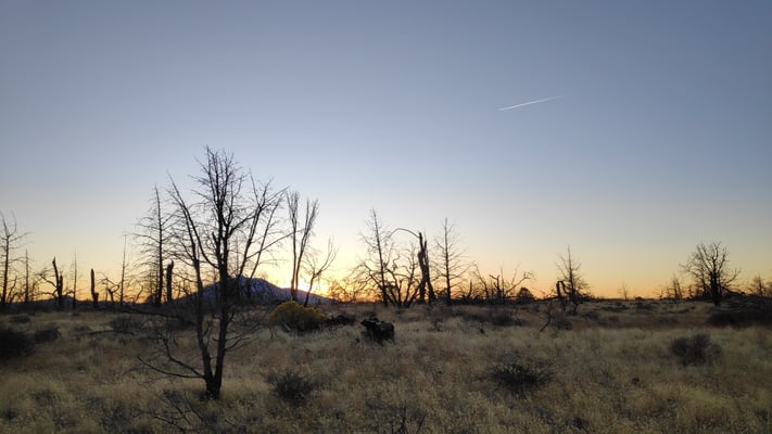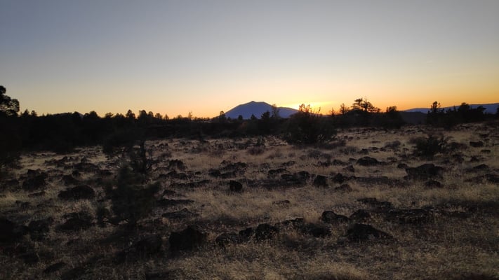 Und so noch zwei Tage, ohne jemanden zu sehen. Sehr schön ist die Strecke über die weite, von vulkanischem Gestein geprägte Hochebene nach der Hat Creek Rim. Da ich inzwischen immer öfter das Solarpanel am Rucksack hängen habe, ich habe eine gute Möglichkeit gefunden, es zu befestigen (war sonst Ollis Job), habe ich genug Akku und höre Musik, Kate Bush, Cat Stevens, Tangerine Dream, Roberta Flack ... Der Sonnenuntergang ist outstanding. Weiter.