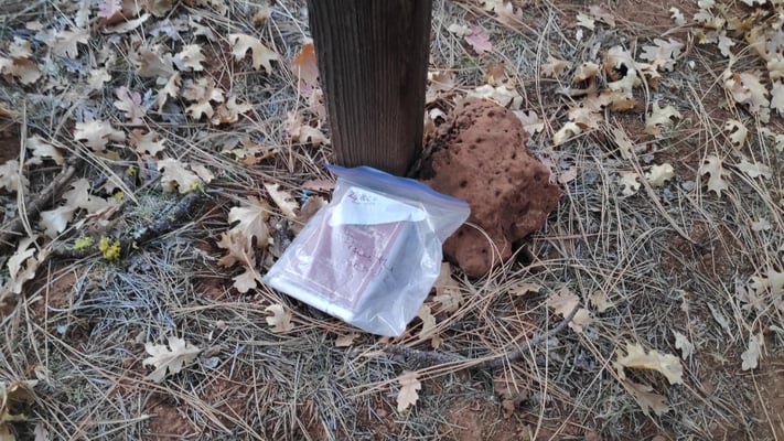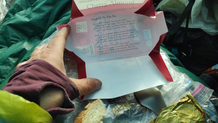 Um 17.50 Uhr werde ich am Trail an der CA 299 von Kathy von der Kirche Word of Life verabschiedet. Sie findet einen guten Platz für meinen Beutel mit Sourdough-Brotscheiben unter der Schnalle an der Seite vom Rucksack. Ich war mal wieder auf Brot umgestiegen, für das es aber im Rucksack einfach keinen Platz mehr hatte ;-)) Es ist eine herzliche Verabschiedung, ich schaue dem Auto hinterher, mache ein Losgehselfie und finde am ersten Wegmarker gleich eine Bibel ...