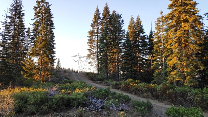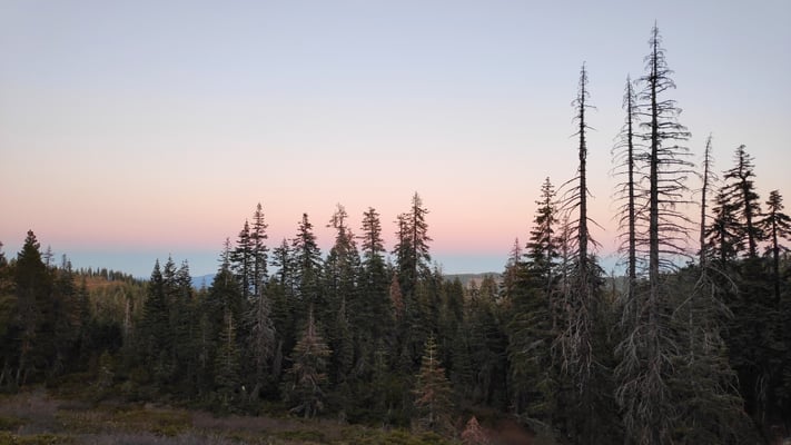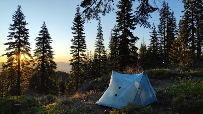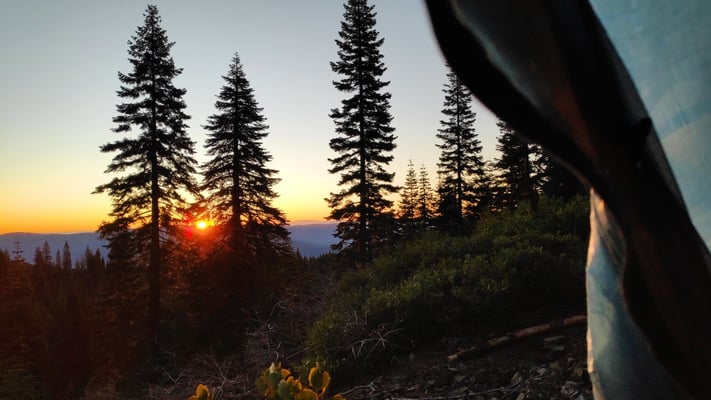 Auf der nächsten Tentsite habe ich beste Sicht, hinter mir eine Dirt Road und ein Strommast, vor mir das waldige Tal. Am nächsten Morgen genieße ich einen umwerfenden Sonnenaufgang. Es gibt AT&T und ich kann ein paar Grüße und Fotos an die Familie verschicken. Ein Mountainbiker radelt vorbei, zwei Autos passieren.