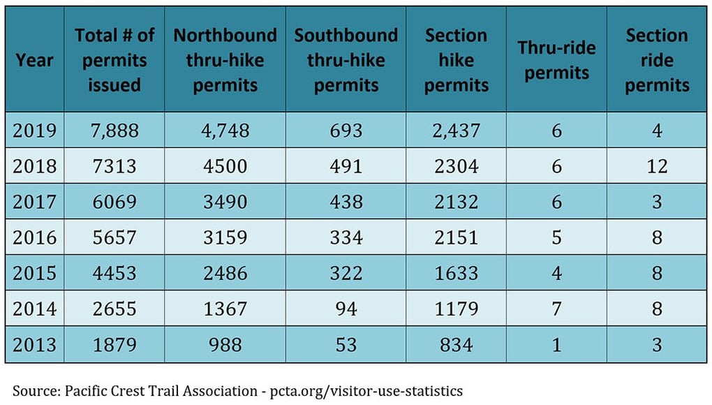 Wer sich dafür interessiert, wieviele Wanderer den Pacific Crest Trail in Angriff nehmen und wieviele davon den PCT tatsächlich erfolgreich beenden, seien die folgenden Tabellen der Pacific Crest Trail Association empfohlen. Das Permit-System der PCTA sieht eine Obergrenze vor (max. 50 pro Tag), In diesem Jahr gab es 5.441 Permits für Long-Distance-Hiker (Section Hiker nicht mitgezählt). Davon haben 919 den PCT komplett beendet. Demnach hat 2019 jeder 6. Hiker die 4.279 km erfolgreich...