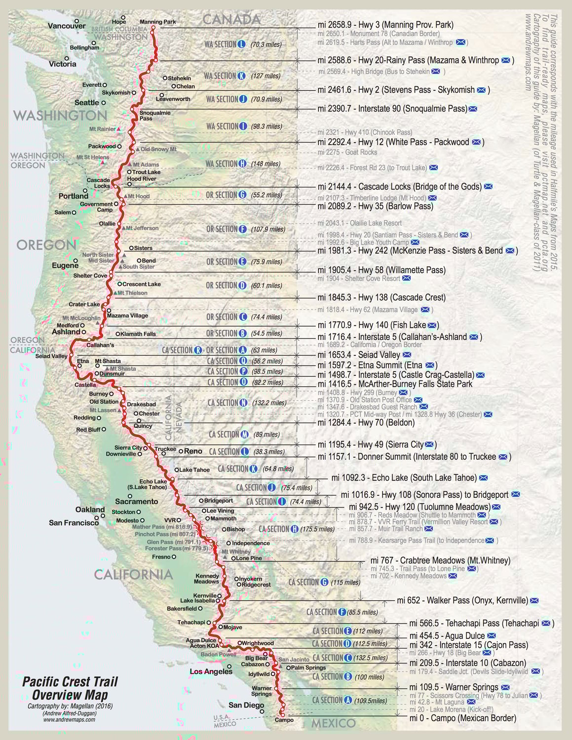 Wer sich mal einen einen Überblick über den Verlauf des PCTs mit seinen Ein- und Ausstiegen verschaffen möchte, sei diese Karte empfohlen. Sabine befindet sich gerade irgendwo zwischen CA (Kalifornien) Section P (Dunsmuir) und Q (Etna). Sie wird den PCT hoffentlich bald in der Nähe von Callahan`s beenden (CA Section R / OR Section A) und darf sich dann Thru-Hikerin nennen.