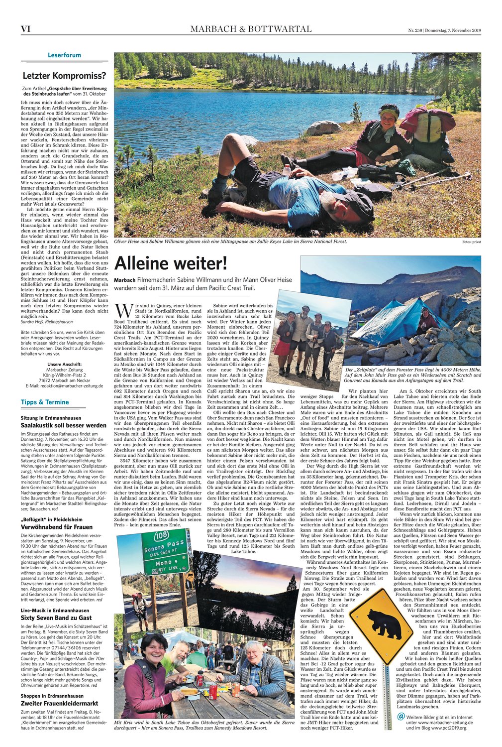 31. Oktober - 6. November, Tage 215-221 PCT Kilometer 2416, gelaufene Kilometer 3921 Die Strecke, die ich bis Dunsmuir vor mir habe, ist ca. 144 km lang. Um 17.50 Uhr werde ich am Trail an der CA 299 von Kathy von der Kirche Word of Life verabschiedet. Sie findet einen guten Platz für meinen Beutel mit Sourdough-Brotscheiben unter der Schnalle an der Seite vom Rucksack. Ich war mal wieder auf Brot umgestiegen, für das es aber im Rucksack einfach keinen Platz mehr hatte ;-)) Es ist eine...